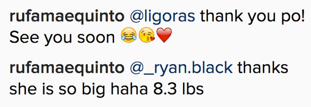 Sa comment section ng kaniyang Instagram account, nagbigay ng ilang detalye si Rufa Mae patungkol sa kaniyang healthy baby girl.