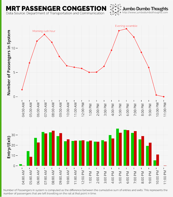 The numbers here seem quite intuitive - during peak times, the system is taking on more people that it can output, and the number of people that are left inside the train system increase. This peak is most apparent in the morning at around 7am, and also in the evening at 6pm. So, if you regularly take the MRT to work or school, it would be best to have a schedule that takes you away from commuting at these times. It might also be useful to know that the traffic load doesn't taper off until you move ahead or behind at least two hours from these peak times.