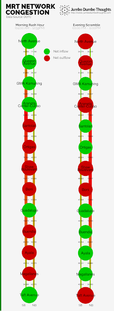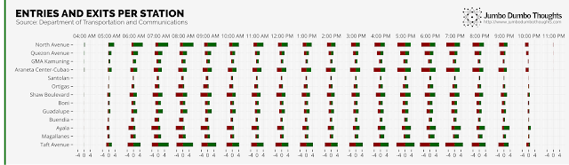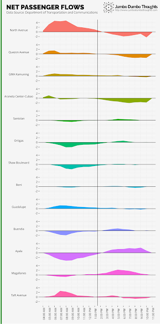 Such a phenomenon is more clearly illustrated in the chart on the left (click to enlarge). Stations near residences and north/south entry points (North Avenue to Araneta Center, Guadalupe, Taft Avenue) have more people coming in that leaving during the day when people are heading to work. Other stations, near workplaces (Santolan, Ortigas, Shaw, Buendia, Ayala, Magallanes), have more people disembarking during the morning rush hour. At around 1pm, the pattern for all of the stations flip, when people begin to return to their homes.