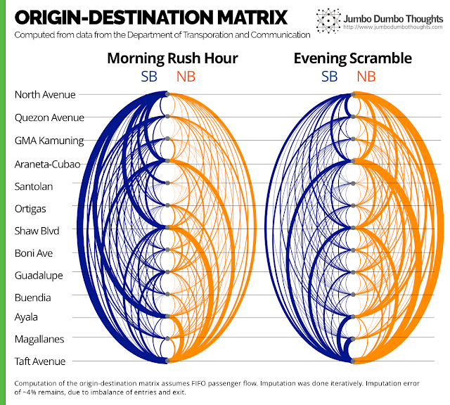 Since we had the entry and exit data per hour, I imputed the origin-destination matrix, i.e. the pairs of origins and destinations for each person riding the MRT. By taking a more detailed view, we can see the particular routes that people would usually take and how we can optimize around them.During the morning, the key routes are those to Ayala, Shaw, and Taft, whereas Taft, Araneta-Cubao, and North Avenue become key destinations in the evening. Although the MRT has no way in which trains can bypass each other (except for the stations in Taft, North Avenue, and Shaw), trains that do not stop at every station, but rather focus on serving busy origin-destination pairs might be feasible if such a method of bypass can be created.