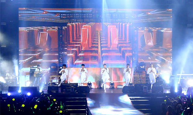 The giant LCD wall opened to reveal the boys, dressed in all white-suits and pumping up the audience with their debut single "O.K.", accompanied by the B1A4 Road Trip band.