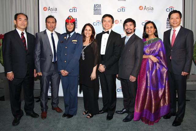 This year's Game Changer awardees (from left): Shuji Nakamura, Aasif Mandvi, Mariam al-Mansouri, Kiran Bir Sethi, Li Cunxin, Manny Pacquiao, Chanda Kochhar, and Lei Jun. Photo: Asia Society
