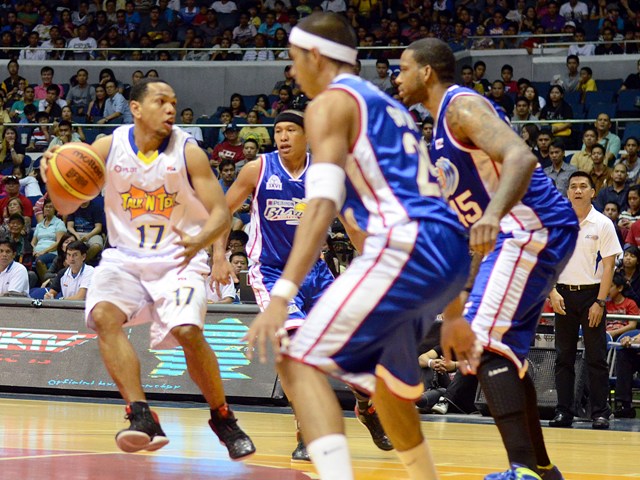 Talk 'N Text playmaker Jason Castro (left) challenges the defense of Petron's Arwind Santos (foreground), import Will McDonald and Dennis Miranda during their game in the 37th PBA Commissioner's Cup. KC Cruz