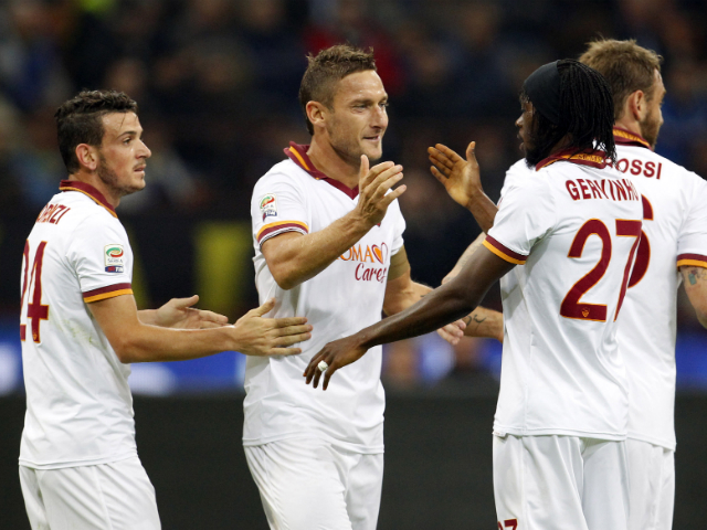 AS Roma's Francesco Totti (2nd L) celebrates with his teammates Alessandro Florenzi (L), Gervinho and Daniele De Rossi (R) after scoring against Inter Milan. Giampiero Sposito / Reuters