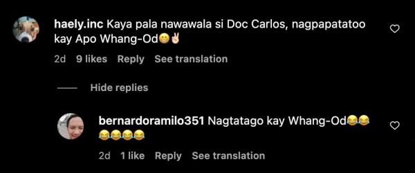 A netizen even humored the actor and said, “Kaya pala nawawala si Doc Carlos, nagpapatatoo kay Apo Whang-Od.”