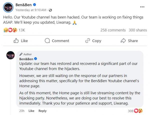 In a statement on Facebook, Ben&Ben informed their fans about the status of their channel, which was showing crypto content.