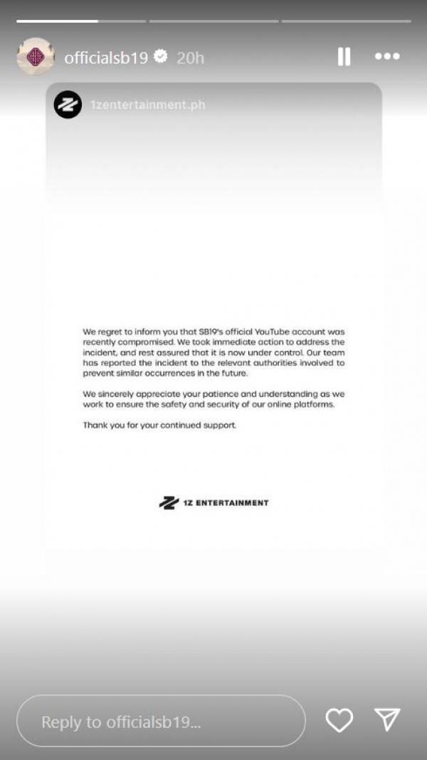 Part of the statement reads, “We regret to inform you that SB19's official YouTube account was recently compromised. We took immediate action to address the incident, and rest assured that it is now under control.”