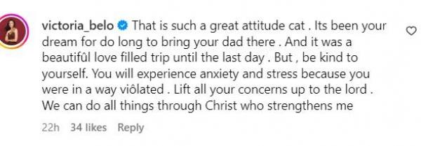 Belo stated, “That is such a great attitude Cat. It's been your dream for so long to bring your dad there. And it was a beautiful love-filled trip until the last day. But, be kind to yourself. You will experience anxiety and stress because you were in a way violated. Lift all your concerns up to the Lord. We can do all things through Christ who strengthens me”