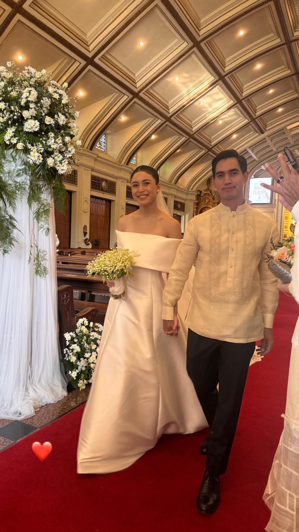 As seen on fencer Jian Miguel Bautista's Instagram story post, Claudia was clad in an elegant white off-shoulder gown, while Basti donned a timeless Barong Tagalog on their wedding day.