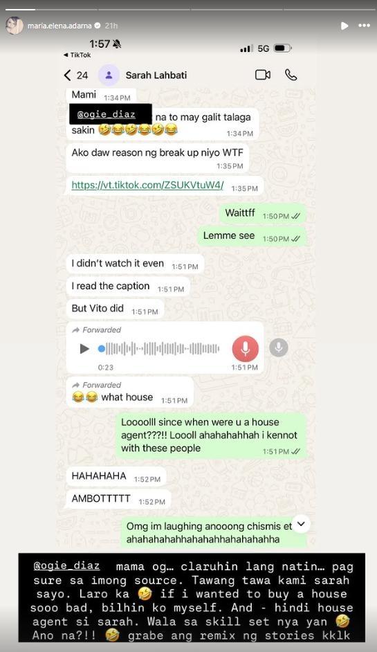 In an Instagram story, Ellen responded to reports discussed by showbiz columnist Ogie Diaz, who shared that Sarah was supposedly involved in her feud with Derek.