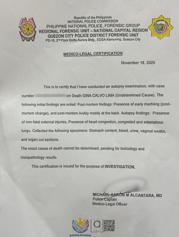 Investigators revealed in a medico-legal certification uploaded by the media that Gina had shown signs "heart congestion" and "congested and edematous lungs."