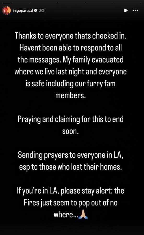 "Praying and claiming for this to end soon. Sending prayers to everyone in LA, [especially] to those who lost their homes," ani Iñigo. "If you're in L.A., please stay alert. The fires just seem to pop out of nowhere..."