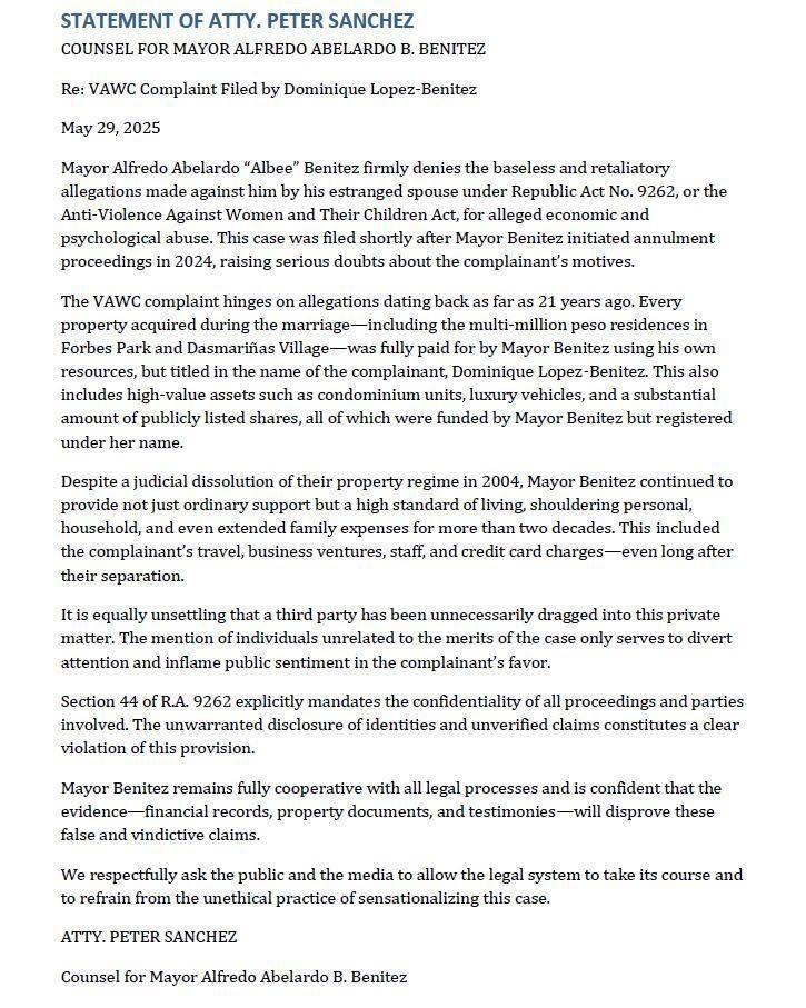 “Mayor Alfredo Abelardo “Albee” Benitez firmly denies the baseless and retaliatory allegations made against him by his estranged spouse under Republic Act No. 9262, or the Anti-Violence Against Women and Their Children Act, for alleged economic and psychological abuse. This case was filed shortly after Mayor Benitez initiated annulment proceedings in 2024, raising serious doubts about the complainant's motives.”