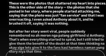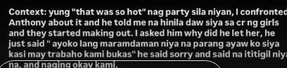 Jam wrote, "Context: 'yung 'that was hot' nag-party sila niyan... I confronted Anthony about it and he told me na hinila daw siya sa CR ng girls and they started making out. I asked him why did he let her, he just said, 'Ayoko lang maramdaman niya na parang ayaw ko siya kasi may trabaho kami bukas.'"
