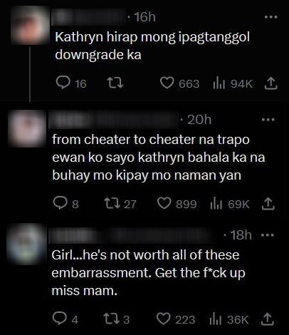 Sabi naman ng isa pang netizen, napunta lang si Kathryn mula sa isang cheater papunta sa isa pang cheater.