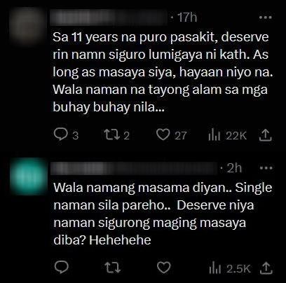 “Sa 11 years na puro pasakit, deserve rin naman siguro lumigaya si Kath. As long as masaya siya, hayaan niyo na. Wala naman na tayong alam sa mga buhay-buhay nila…” sabi ng netizen.