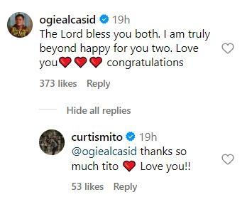 "The Lord bless you both. I am truly beyond happy for you two. Love you congratulations," the OPM King said.