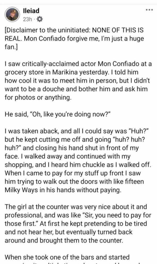 “Disclaimer to the uninitiated: NONE OF THIS IS REAL. Mon Confiado forgive me, I'm just a huge fan,” saad sa naturang post.