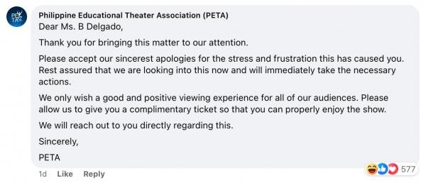 Philippine Education Theatrical Association (PETA) apologized to the showgoer who got distracted by fellow attendees using gadgets - specifically cell phones and a laptop - during a show of 'One More Chance: The Musical.'