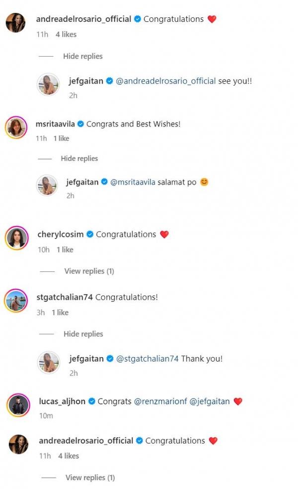Many celebrities congratulated the Renz and Jef, including Black Rider star Jon Lucas, Rita Avila, and Andrea del Rosario.