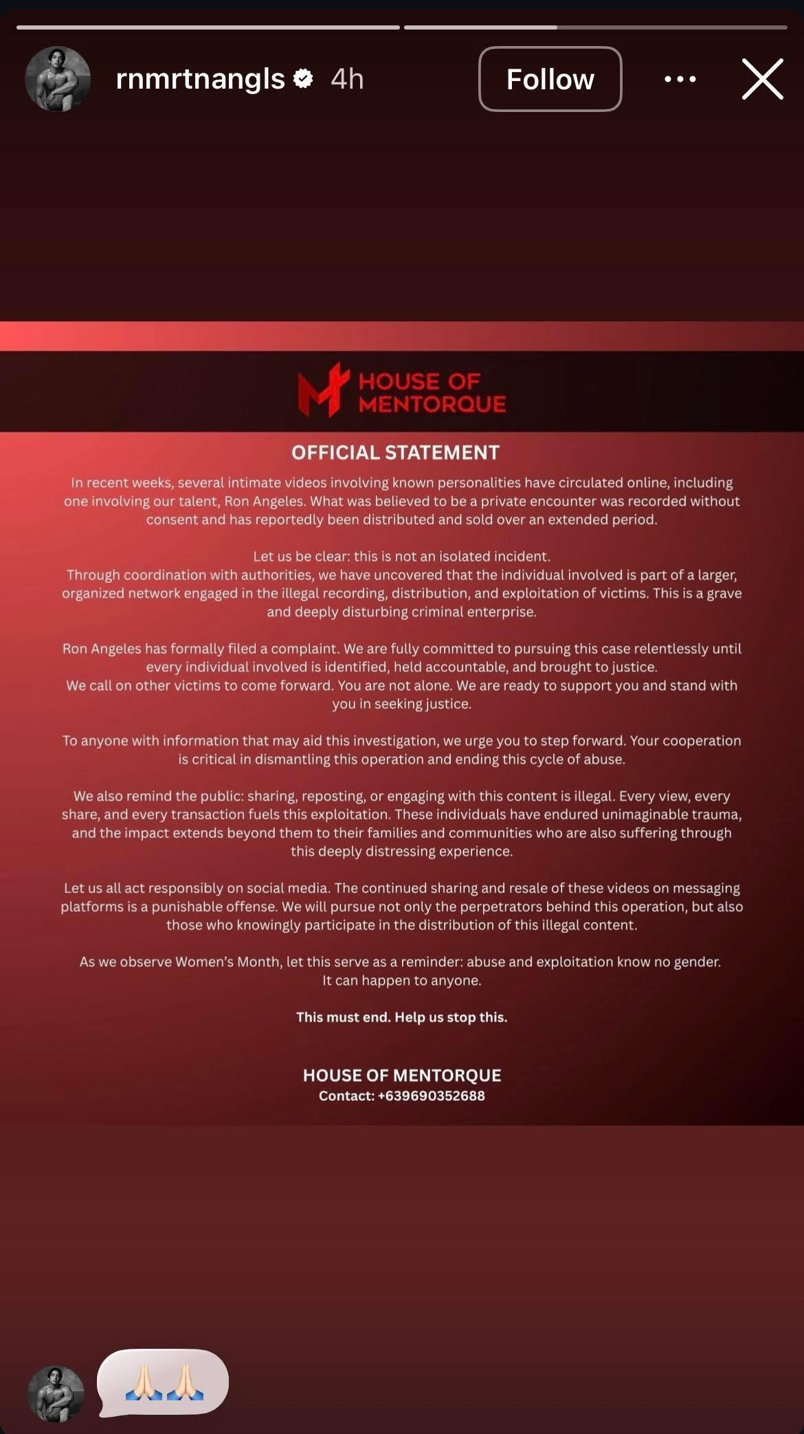 Nabanggit din sa statement na pormal nang nagsampa ng reklamo si Ron Angeles tungkol dito at kasalukuyan siyang nakikipagtulungan sa mga awtoridad upang matunton na ang mga sangkot sa pagkalat ng video.