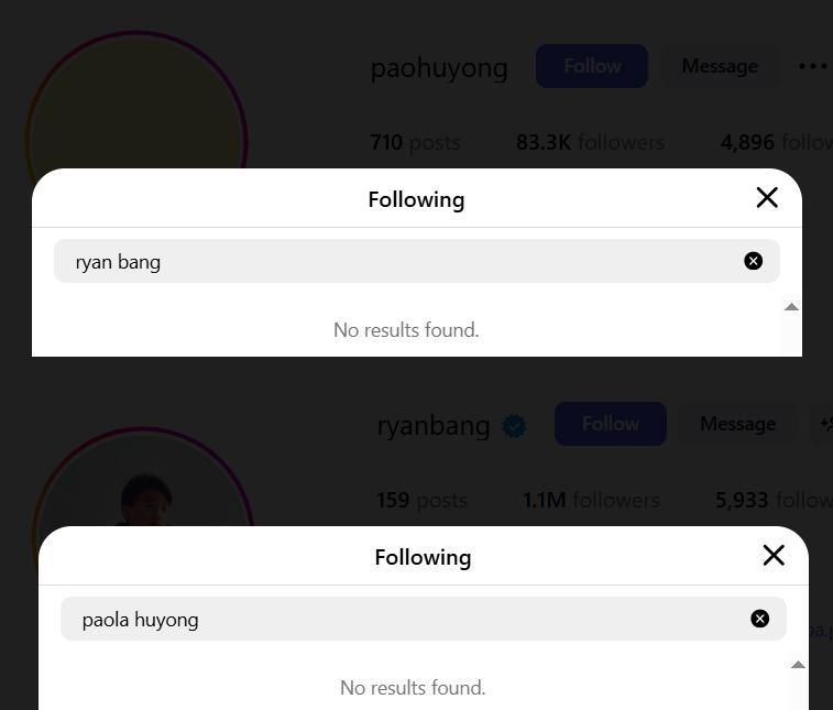 Eagle-eyed netizens have noticed that It's Showtime host Ryan Bang and his entrepreneur fiancée Paola Huyong are no longer following each other on Instagram.