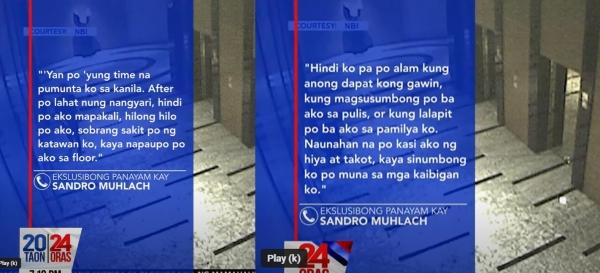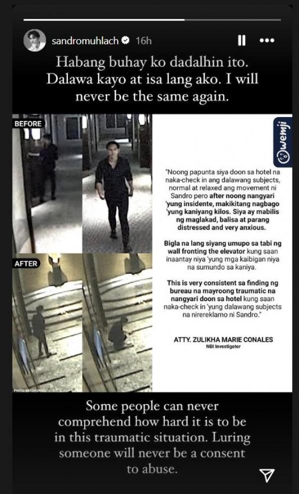 SRA Zulikha Marie Conales, the NBI agent handling the actor's case stated, "Noong papunta siya doon sa hotel na naka-check in ang dalawang subjects, normal at relaxed ang movement ni Sandro. Pero after noong nangyari 'yung insidente ng pangmomolestya, makikitang nagbago 'yung kaniyang kilos."