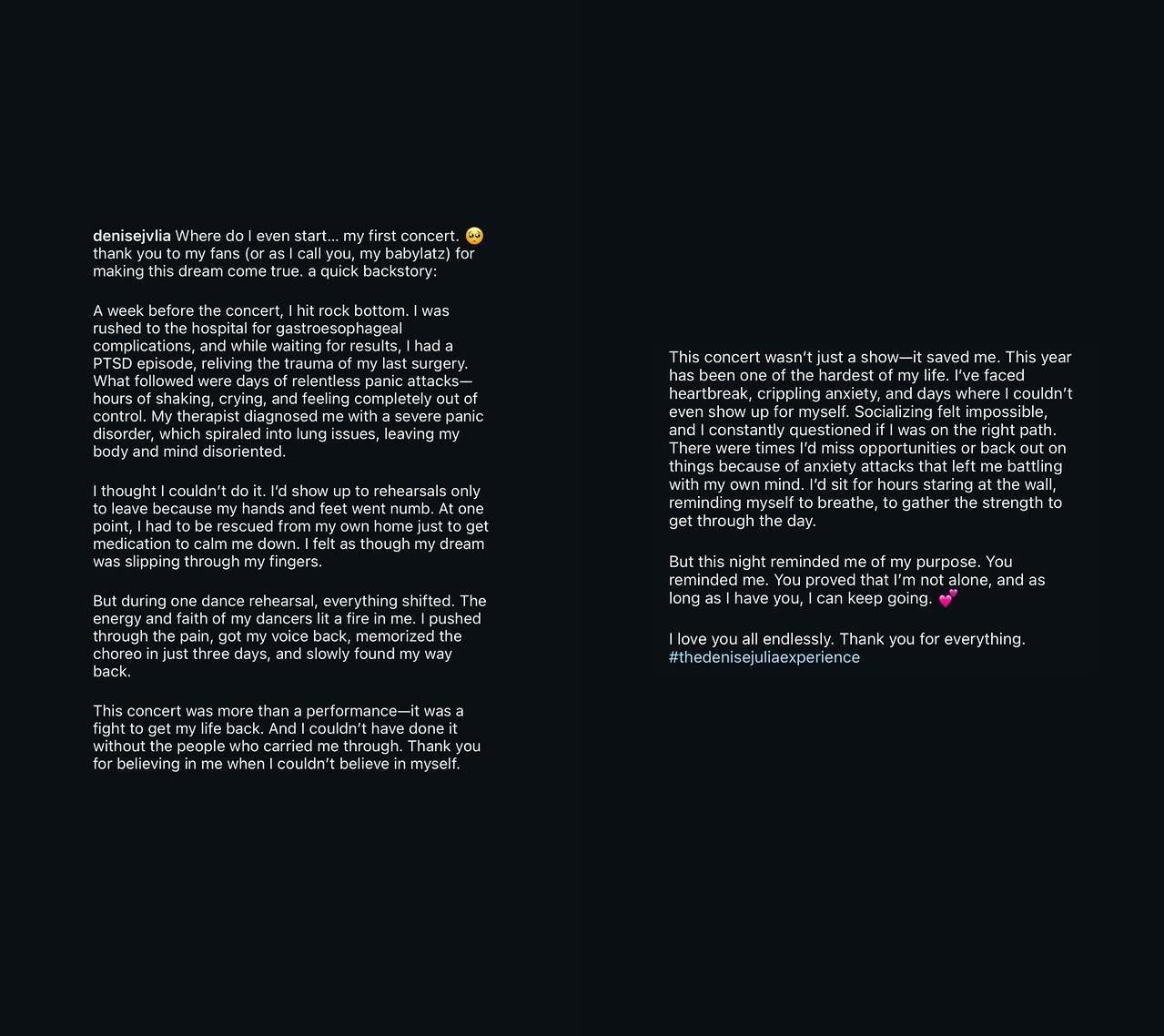 She said, "Where do I even start… my first concert. thank u to my fans [or as I call you, my babylatz] for making this dream come true. a quick backstory: A week before the concert, I hit rock bottom. I was rushed to the hospital for gastroesophageal complications, and while waiting for results, I had a PTSD episode, reliving the trauma of my last surgery.