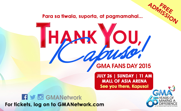 Para sa tiwala, suporta, at pagmamahal ng mga Kapuso sa nakalipas na 65 taon, magsasagawa ang GMA Network ng GMA Fans Day sa July 26, 2015, Linggo, sa Mall of Asia Arena.
