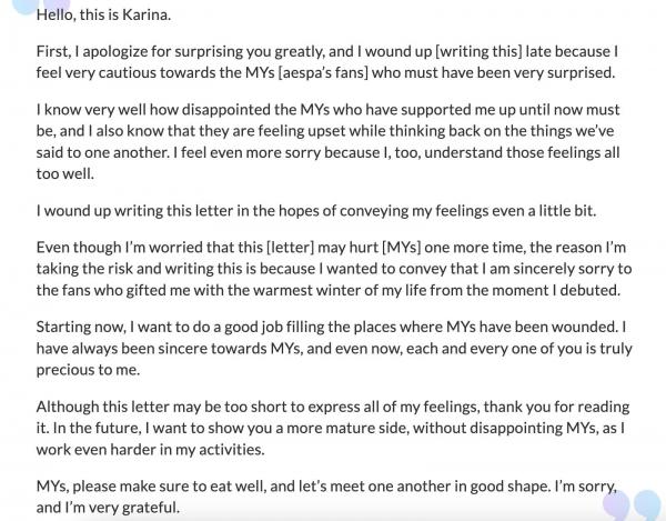 Soompi, one of Korea's trusted online news sites, translated Karina's message which she started by apologizing right away for surprising the fans greatly, and saying that she was late in writing the letter because she was cautious towards the MYs who must have been very surprised by the dating news.