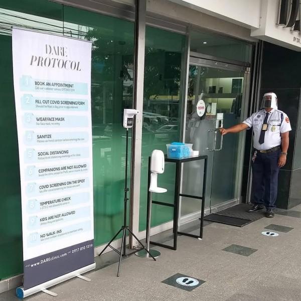 The DARE resident dermatologist then gave a walkthrough of how they do things in her clinic including putting several acrylic barriers in the reception, markers for social distancing, alcohol dispensers scattered in the area, and a thermal scanner by the entrance instead of a thermometer gun.