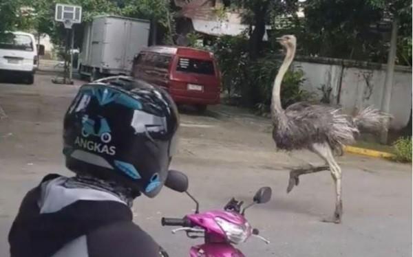 Earlier this week, a clip of an ostrich escaping into the streets and chasing a car in a subdivision in Quezon City was caught on camera by Dino Rivera.