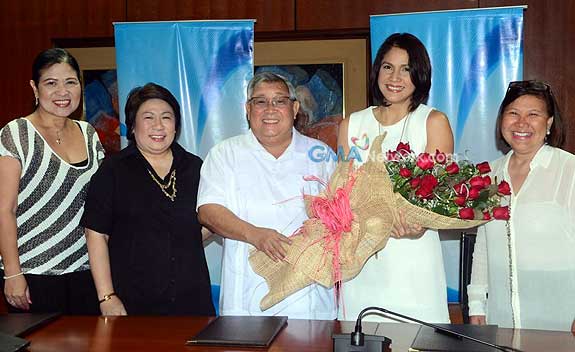 Present in the contract signing were (from left) AVP for Entertainment TV Redgie Acuña-Magno, GMA Entertainment TV's OIC Lilybeth G. Rasonable, GMA Chairman and CEO Atty. Felipe L. Gozon, Agot and Shirley Kuan (Agot's manager).