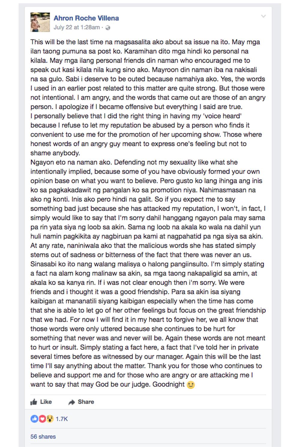 Isang mahabang statement ang nilabas ni Ahron nitong Sabado, July 22 sa Facebook.