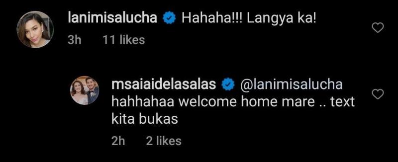 The 57-year-old actress replied, “@lanimisalucha haha welcome home mare. Text kita bukas.”