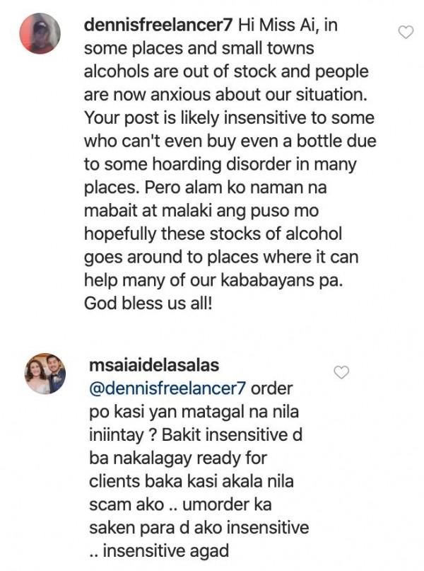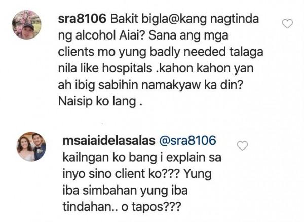 Sambit ng isang netizen, “Bakit bigla kang nagtinda ng alcohol, Aiai? Sana ang clients mo 'yung badly needed talaga like hospitals. Kahon kahon 'yan ah! Ibig sabihin, namakyaw ka rin? Naisip ko lang.”