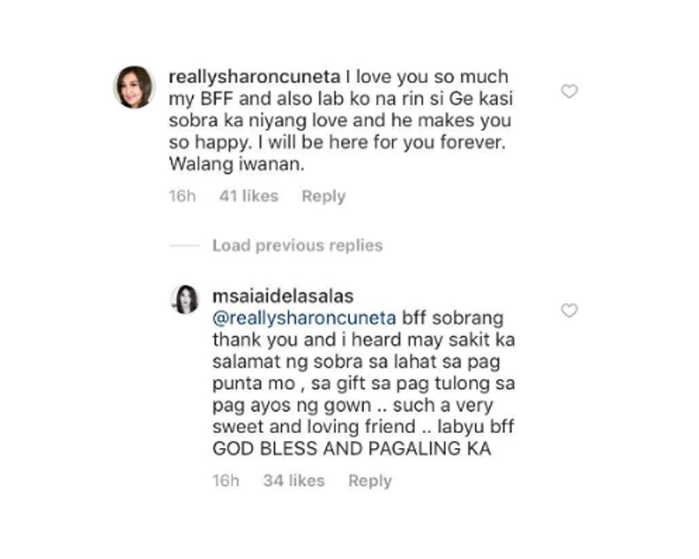 "Sobrang thank you and I heard may sakit ka. Salamat nang sobra sa lahat sa pagpunta mo, sa gift, sa pagtulong sa pag-ayos ng gown...such a very sweet and loving friend. Labyu, BFF. God bless and pagaling ka,' wrote Aiai.