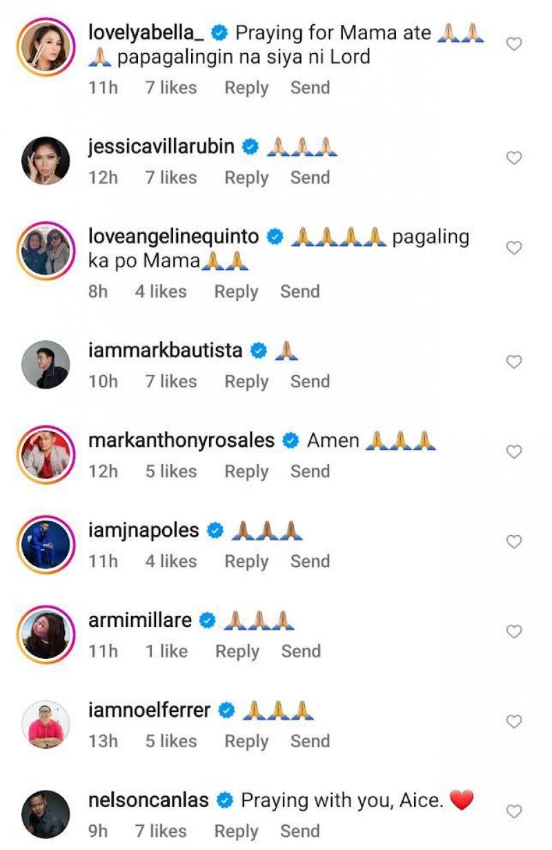 Several celebrities reacted to Aicelle's post and sent their support for the singer and her mom including Nelson Canlas, Lovely Abella, Angeline Quinto, Mark Bautista, and Jessica Villarubin.