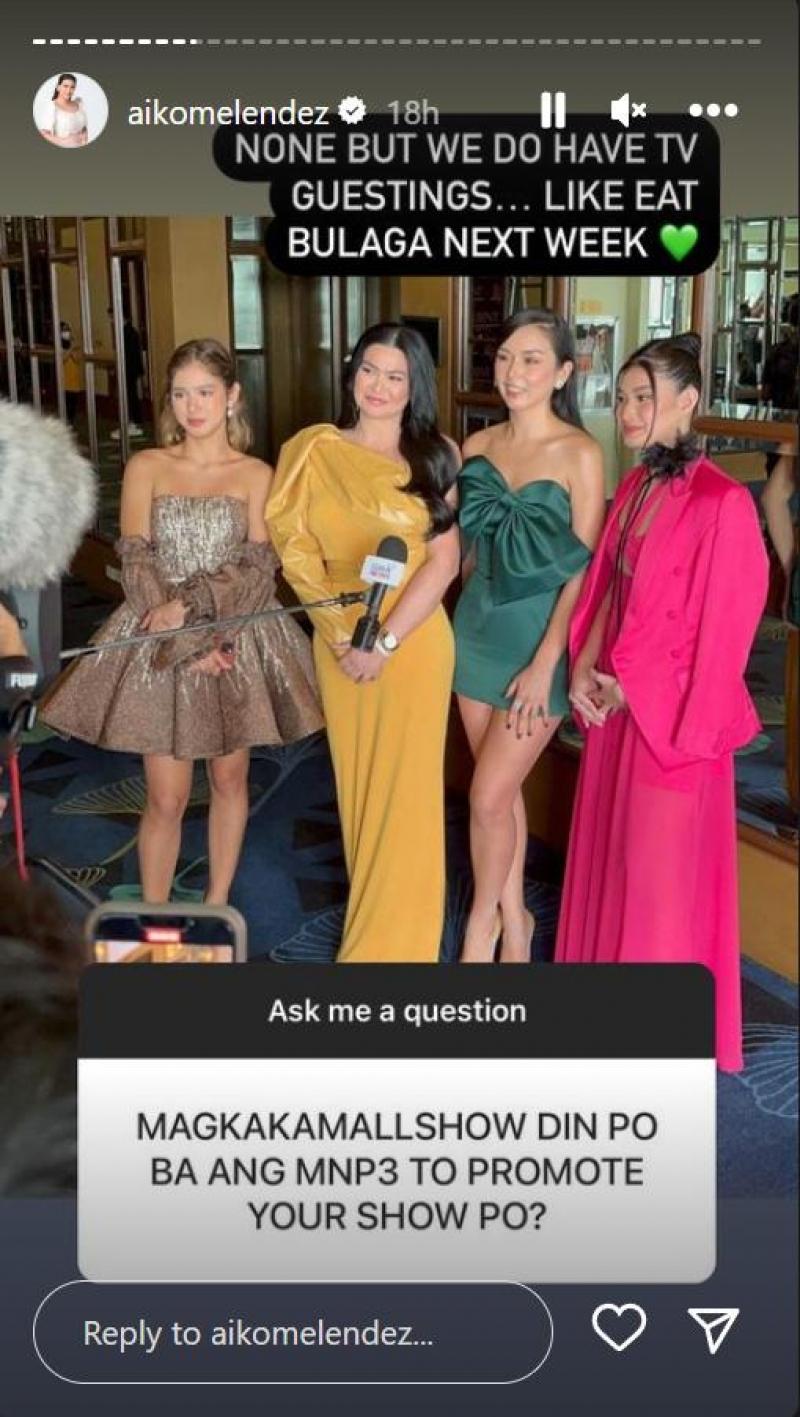 Ayon kay Aiko, dapat abangan ang guesting nila sa Eat Bulaga ng Mano Po Legacy: The Flower Sisters co-stars niyang sina Beauty Gonzalez, Thea Tolentino, at Angel Guardian.