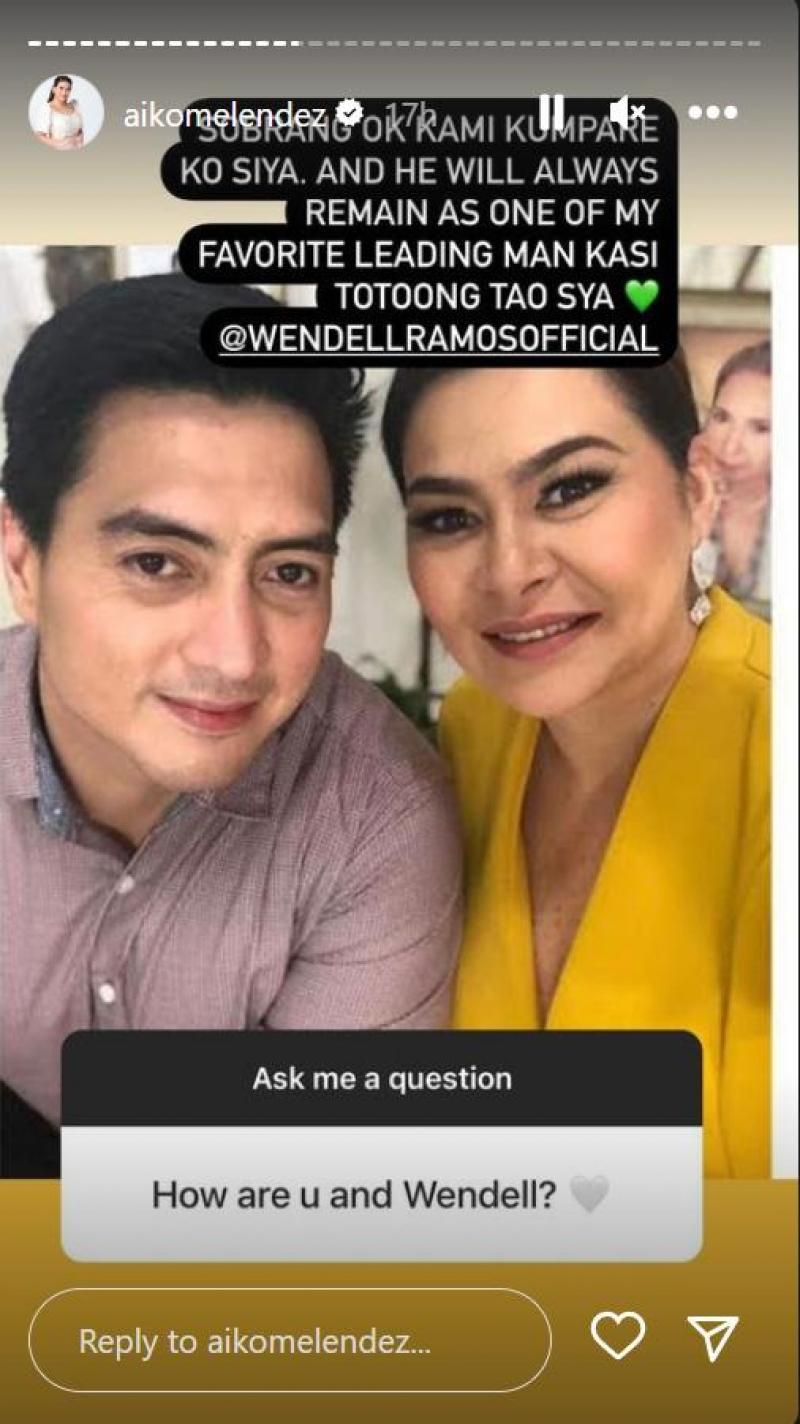 Shinare rin ni Aiko ang personal relationship niya sa kanyang Prima Donnas co-star na si Wendell Ramos na inilarawan niyang "one of my favorite leading men" at "totoong tao."