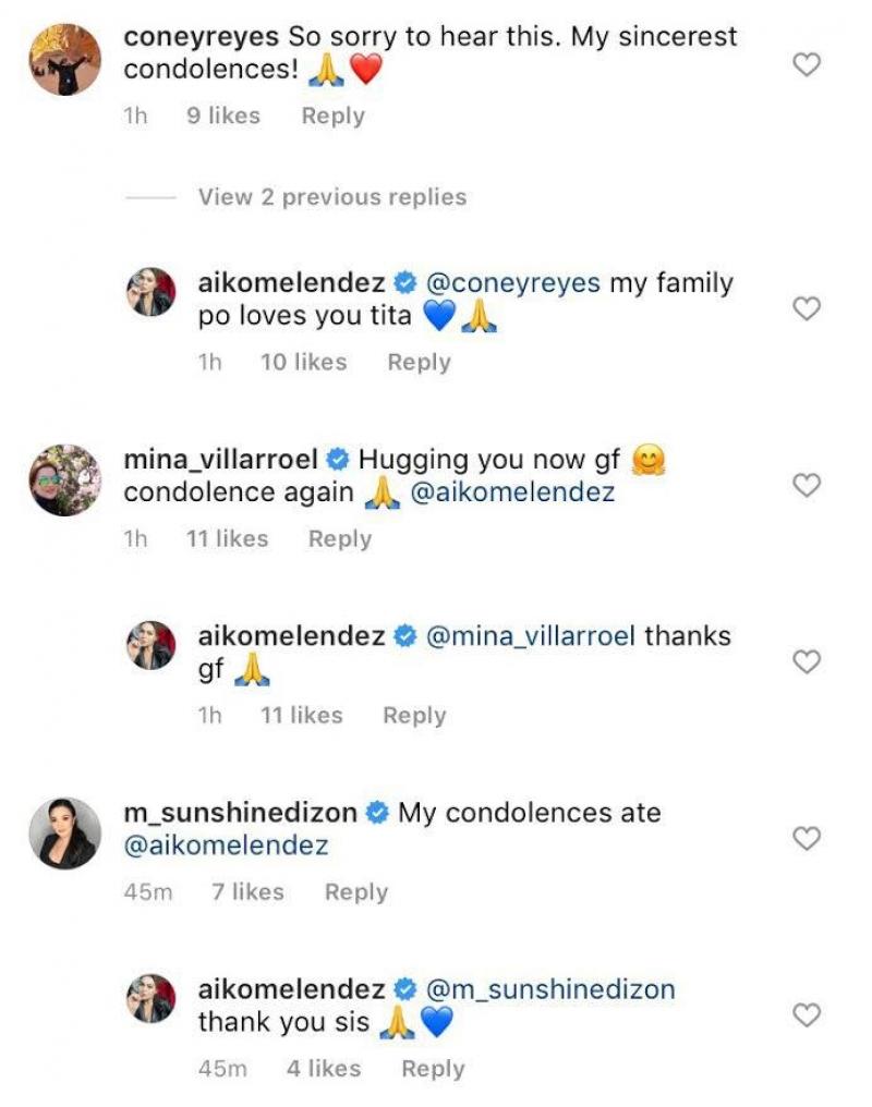 Magkaagaw star Sunshine Dizon wrote, "My condolences ate @aikomelendez."
