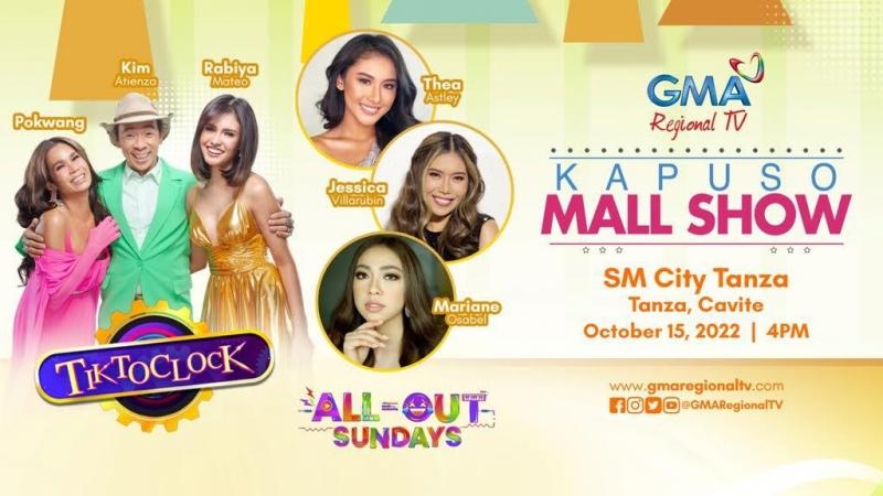 'TiktoClock,' GMA's countdown game-variety show, and 'All-Out Sundays,' the Network's hit musical-comedy-variety program, are off to Cavite this Saturday (October 15) for a Kapuso Mall Show in SM City Tanza, Cavite at 4PM. Catch the fun and excitement with the TiktoClock hosts: well-loved comedienne and award-winning actress Pokwang, Miss Universe Philippines 2020 Rabiya Mateo, and everyone's favorite trivia man Kuya Kim Atienza. Expect powerful performances from AoS' Queendom, Mariane Osabel, Thea Astley, and Jessica Villarubin.