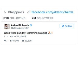 Good vibes Sunday! Maraming salamat. ???????? pic.twitter.com/2SX03SfPkM — Alden Richards (@aldenrichards02) October 4, 2015