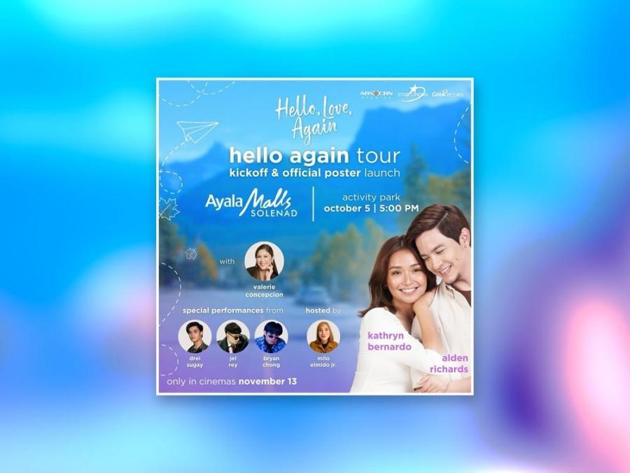 Alden Richards and Kathryn Bernardo will kick off the nationwide tour for their upcoming Hello, Love, Again with a mall show in Ayala Malls Solenad.