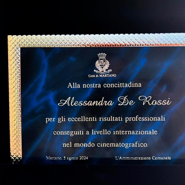 "To our fellow citizen Alessandra de Rossi for the excellent professional results achieved at an international level in the cinematographic world," the Italian text of the plaque read.