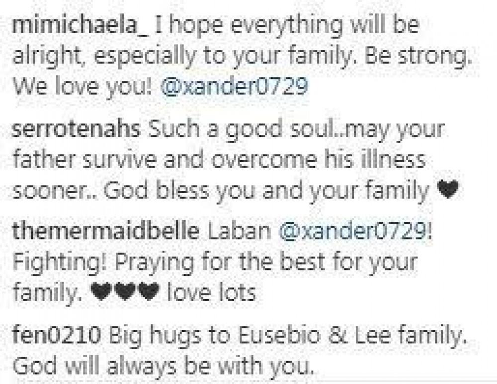 "Thank you for reading this long message. If u read all, hope it’ll make u think differently too. For those whose family is suffering from sickness, I pray in Jesus’ name that you will have peace and strong faith to overcome the tough moments. What doesn’t kill u makes u stronger. Also, please cherish your family members, friends, and loved ones. Cherish them like there is no tomorrow with them, alright? Love you all and God bless. XOXO, Xander."