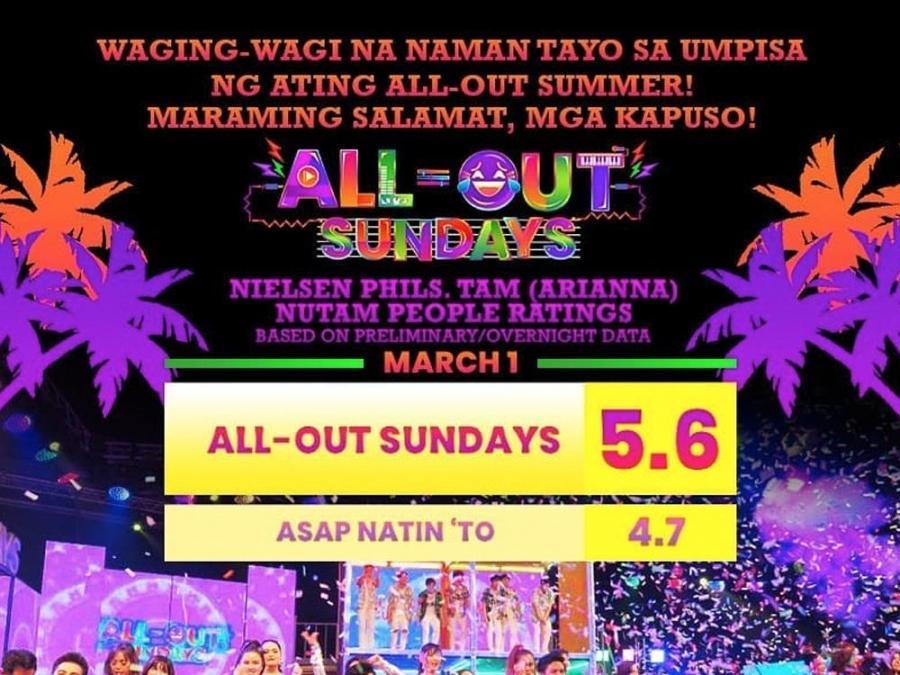 Waging wagi muli sa ratings ang All-Out Sundays nitong nakaraang linggo sa kanilang summer kick-off episode nitong March 1.