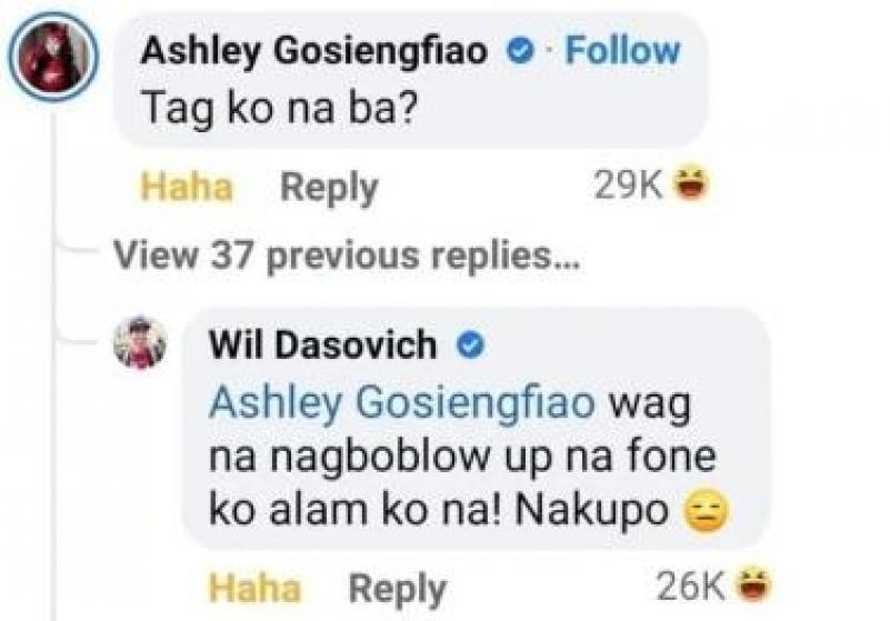 The real "Will" in Alodia's past dropped by the comments section and responded to Ashley, saying, "Wag na nag-boblow up na fone ko alam ko na! Nakupo," Will Dasovich wrote.