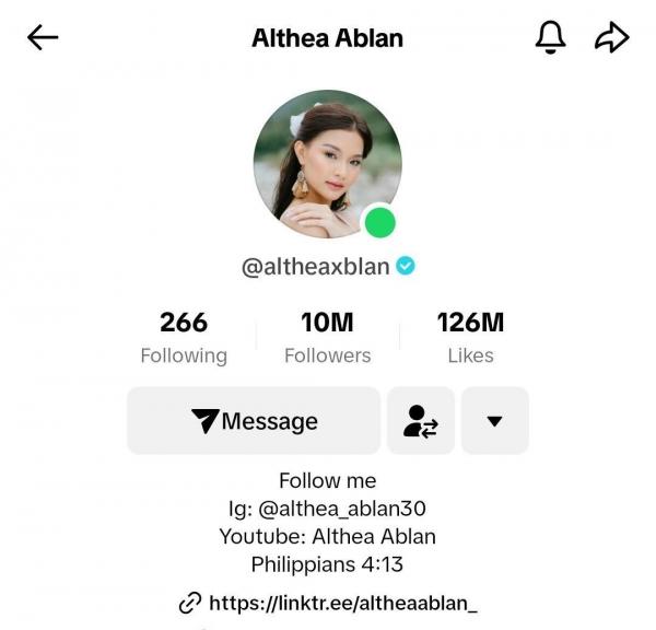 Aside from TikTok, Althea has a strong social media presence with more than 7 million followers on Facebook and 2 million followers on Instagram. She also has over 465,000 subscribers on YouTube.