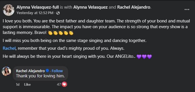 "I love you both. You are the best father-and-daughter team. The strength of your bond and mutual support is immeasurable. The impact you have on your audience is so strong that every show is a lasting memory. Bravo! I will miss you both being on the same stage singing and dancing together," ani Alynna.